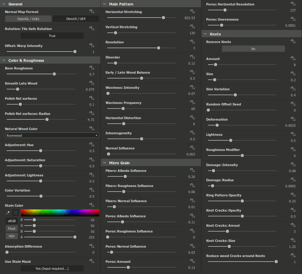 Depending on what you are creating (natural pine, polished oak, artificial Ikea veneer…) the influence of fibers and pores on Albedo, Roughness and Normal varies. Therefore, you can adjust the intensity separately for each map.